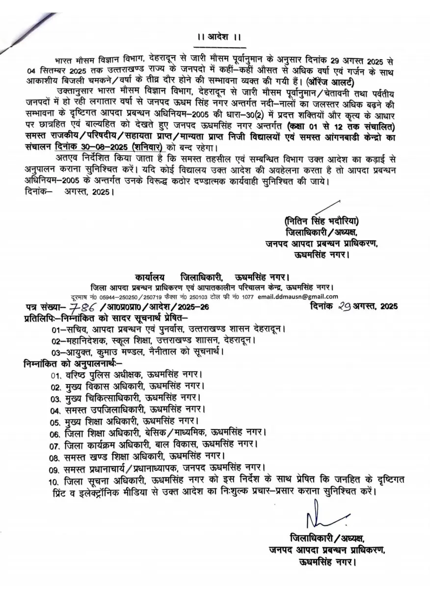 लगातार हो रही बारिश और पर्वतीय क्षेत्रों में नदियों-नालों के जलस्तर बढ़ने के खतरे को देखते हुए जनपद ऊधमसिंह नगर प्रशासन ने शनिवार (30 अगस्त 2025) को जिले के सभी सरकारी, अशासकीय, परिषदीय, सहायता प्राप्त एवं मान्यता प्राप्त निजी विद्यालयों (कक्षा 1 से 12 तक) के साथ ही सभी आंगनबाड़ी केंद्रों को बंद रखने का आदेश दिया है।
