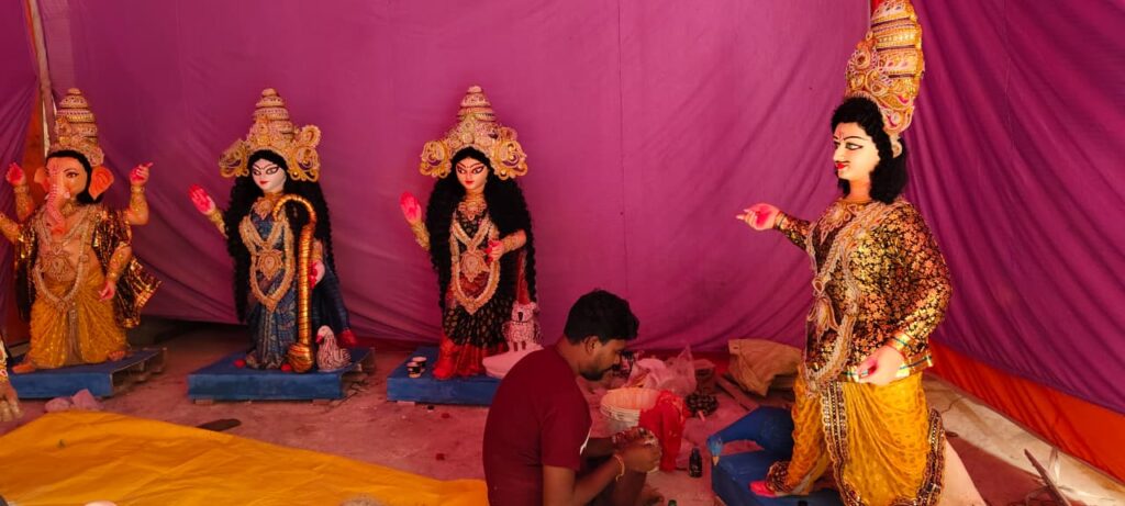 मंदिर परिसर में प्रतिमाओं को अंतिम रूप देने का कार्य जारी है। कानपुर से आए मूर्तिकार विक्रम सरकार ने बताया कि इस वर्ष सभी प्रतिमाएं पूरी तरह प्राकृतिक सामग्री से बनाई जा रही हैं ताकि विसर्जन के दौरान पर्यावरण को नुकसान न पहुंचे। उनके साथ विश्वजीत, जय और प्रेम भी प्रतिमा निर्माण कार्य में सहयोग कर रहे हैं।