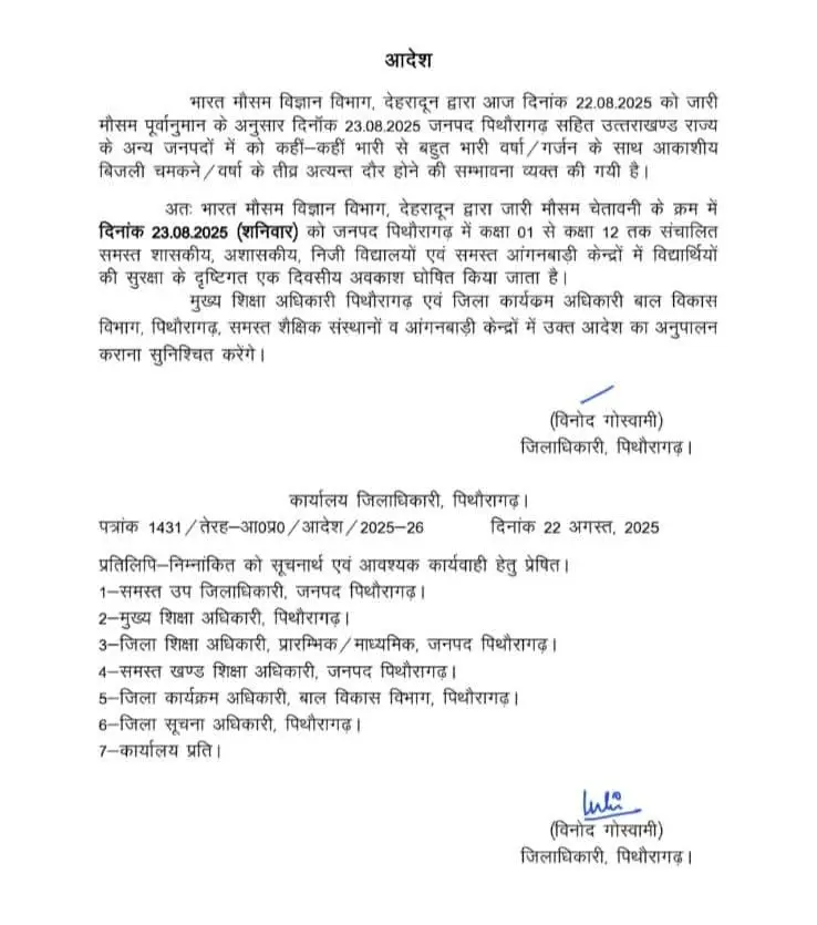 भारत मौसम विज्ञान विभाग, देहरादून ने 23 अगस्त 2025 को उत्तराखंड के कई जनपदों के लिए भारी से बहुत भारी बारिश, आकाशीय बिजली गिरने और तेज गर्जना की चेतावनी जारी की है। विशेषकर पिथौरागढ़ जिले को इस अलर्ट का सर्वाधिक असर झेलना पड़ सकता है।