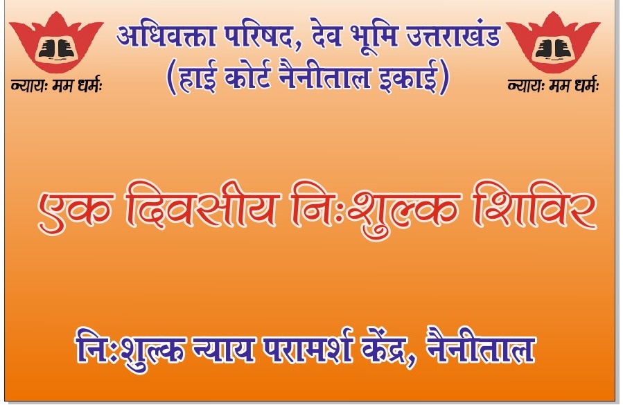नैनीताल: अधिवक्ता परिषद देवभूमि उत्तराखंड हाई कोर्ट (इकाई) नैनीताल द्वारा दशहरा के उपलक्ष्य में दिनांक 2 अक्टूबर को एक दिवसीय निःशुल्क शिविर आयोजित किया जाएगा। यह शिविर प्रातः 11:00 बजे से शाम 4:00 बजे तक नैनीताल में गुरुद्वारा के समीप डीएसए फील्ड में आयोजित होगा। इस अवसर पर हाई कोर्ट के अधिवक्ताओं द्वारा न्याय से संबंधित सभी कानूनी सलाह और जानकारी नि:शुल्क प्रदान की जाएगी। शिविर का लाभ नैनीताल नगर और ग्रामीण क्षेत्र से आए हुए सभी नागरिक उठा सकेंगे।