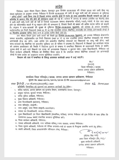 इसी वजह से नैनीताल जिले के समस्त शासकीय, अशासकीय और निजी विद्यालयों (कक्षा 1 से 12 तक), समस्त आंगनबाड़ी केंद्रों में एक दिन का अवकाश घोषित किया गया है। आदेश स्पष्ट करता है कि विद्यार्थियों की सुरक्षा को देखते हुए 3 सितंबर 2025 (बुधवार) को सभी शैक्षणिक संस्थान बंद रहेंगे।