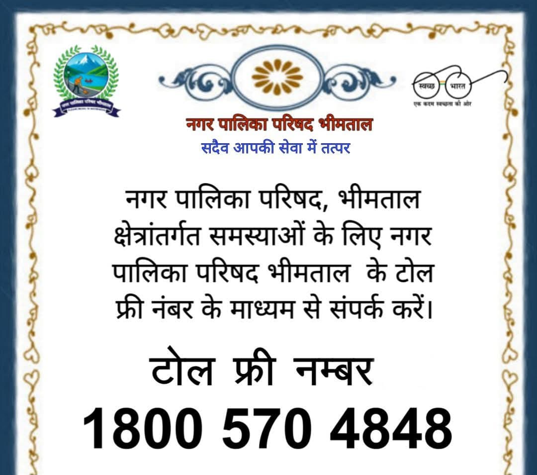 भीमताल। नगर पालिका परिषद भीमताल ने स्थानीय लोगों की सुविधा और समस्याओं के समाधान के लिए टोल फ्री नंबर 18005704848 जारी किया है। यह सेवा उन नागरिकों को ध्यान में रख कर शुरू की गई है जिन्हें सफाई, पथ प्रकाश, प्रमाण पत्र जैसी सुविधाओं और जानकारी के लिए बार-बार नगर कार्यालय जाना पड़ता था