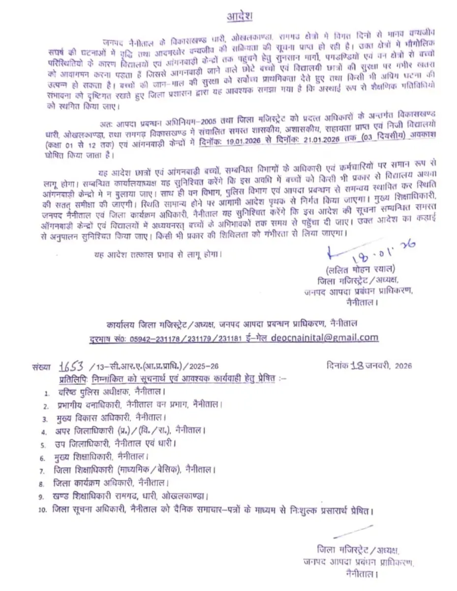 नैनीताल। जिले में लगातार सामने आ रही मानव-वन्यजीव संघर्ष की घटनाओं को गंभीरता से लेते हुए जिलाधिकारी ललित मोहन रयाल ने अहम आदेश जारी किया है। बच्चों की सुरक्षा को देखते हुए धारी, ओखलकांडा और रामगढ़ विकासखंडों में आंगनबाड़ी केंद्रों सहित कक्षा 1 से 12 तक के सभी सरकारी और निजी स्कूलों में तीन दिवसीय अवकाश घोषित किया गया है।