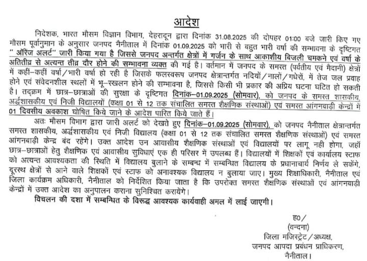 उत्तराखंड नैनीताल बड़ी खबर: अत्यधिक बारिश का अलर्ट, कल नैनीताल जिले में सभी स्कूल रहेंगे बंद Ankita Mehra August 31, 2025 नैनीताल। मौसम विभाग द्वारा सोमवार को जिले में भारी वर्षा की संभावना जताई गई है। इस चेतावनी को देखते हुए जिलाधिकारी वंदना ने सुरक्षा की दृष्टि से नैनीताल जनपद के सभी स्कूलों में एक दिन का अवकाश घोषित कर दिया है। Post navigation Previous मौसम विभाग की चेतावनी और पांच दिन टेंशन देगी बारिश, कल नैनीताल के लिए रेड अलर्ट जारी, सावधान रहेNext अष्टमी पर नंदा देवी मंदिर में उमड़ा श्रद्धालुओं का सैलाब, माता के एक दर्शन लिए बेताब है लोग Related Stories उत्तराखंड: 5 साल का मासूम को उठा ले गया गुलदार, माँ का रो रो कर बदहवास उत्तराखंड नैनीताल उत्तराखंड: 5 साल का मासूम को उठा ले गया गुलदार, माँ का रो रो कर बदहवास February 4, 2026 आख़िरकार उपनल कर्मचारियों के लिए जारी हुआ, समान काम समान वेतन का आदेश उत्तराखंड देहरादून आख़िरकार उपनल कर्मचारियों के लिए जारी हुआ, समान काम समान वेतन का आदेश February 4, 2026 नैनीताल: क्रिकेट टूर्नामेंट को लेकर तीन घंटे तक चला घमासान, नाराज़ नगर पालिका ने चुंगी बंद कराई, पिच पर बैठा धरना उत्तराखंड नैनीताल नैनीताल: क्रिकेट टूर्नामेंट को लेकर तीन घंटे तक चला घमासान, नाराज़ नगर पालिका ने चुंगी बंद कराई, पिच पर बैठा धरना February 3, 2026