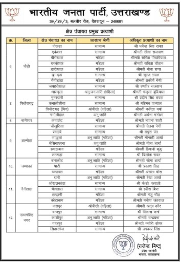 देहरादून। उत्तराखंड में त्रिस्तरीय पंचायत चुनाव की प्रक्रिया तेज हो गई है। भारतीय जनता पार्टी ने ब्लॉक प्रमुख पदों के लिए अपने अधिकृत प्रत्याशियों की सूची जारी कर दी है। पार्टी की त्रिस्तरीय पंचायत चुनाव समिति की बैठक में सभी नामों पर सर्वसम्मति से मुहर लगाई गई।