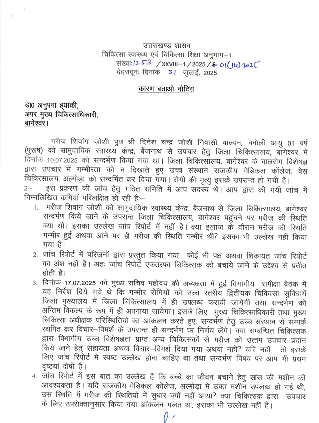 इसके अलावा, बाल रोग विशेषज्ञ डॉ. अंकित कुमार पर भी गंभीर आरोप लगाए गए हैं कि उन्होंने मासूम के इलाज में गंभीरता नहीं दिखाई और हल्द्वानी रेफर कर दिया, जिससे बच्चे की मौत हो गई। उन्हें भी कारण बताओ नोटिस भेजा गया है।