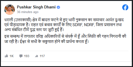 मुख्यमंत्री पुष्कर सिंह धामी ने स्थिति पर चिंता जताते हुए कहा कि राहत और बचाव अभियान युद्धस्तर पर चलाया जा रहा है।
