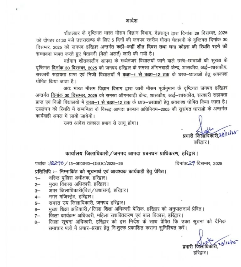इसी के मध्यनज़र हरिद्वार में कल 30 दिसंबर 2025 को जिले के सभी आगनबाड़ी, शासकीय अर्धशासकीय सरकारी व सहायता प्राप्त व निजी स्कूलों में 1 से 12वि तक के स्कूल में अवकाश दे दिया गया हैं।