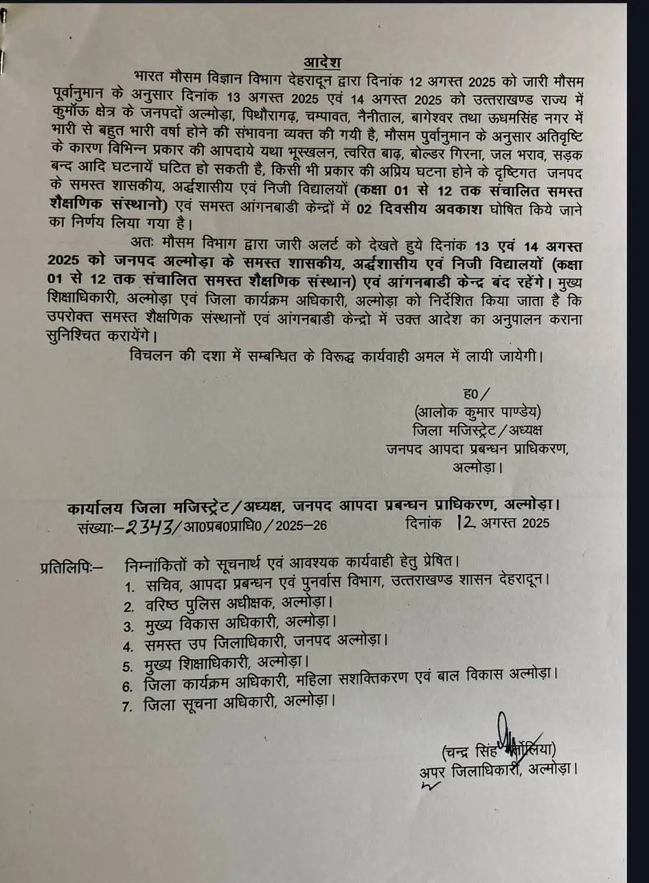 पूर्वानुमान के मुताबिक, इस दौरान अतिवृष्टि से भूस्खलन, अचानक बाढ़, बोल्डर गिरना, जलभराव और सड़क बंद होने जैसी आपदाएं आ सकती हैं। किसी भी अप्रिय घटना से बचाव के लिए प्रशासन ने अल्मोड़ा जनपद के सभी सरकारी, अर्द्धसरकारी और निजी विद्यालयों (कक्षा 1 से 12 तक) के साथ-साथ सभी आंगनबाड़ी केंद्रों में दो दिन का अवकाश घोषित कर दिया है।
