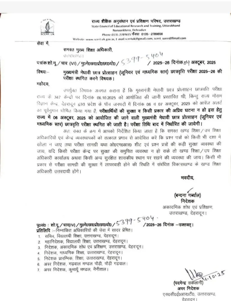 राज्य मौसम विज्ञान केंद्र, देहरादून द्वारा 6 और 7 अक्टूबर को प्रदेश के पांच जिलों में ऑरेंज अलर्ट जारी किया गया है। मौसम विभाग के पूर्वानुमान को देखते हुए शिक्षा विभाग ने परीक्षार्थियों की सुरक्षा को प्राथमिकता देते हुए यह निर्णय लिया है।