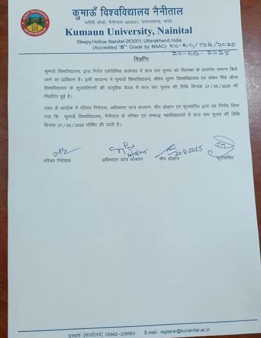 नैनीताल। लंबे इंतजार के बाद आखिरकार छात्र राजनीति को लेकर बड़ा फैसला सामने आया है। कुमाऊँ विश्वविद्यालय प्रशासन ने स्पष्ट कर दिया है कि छात्र संघ चुनाव 27 सितम्बर 2025 को आयोजित किए जाएंगे। यह निर्णय कुमाऊँ विश्वविद्यालय, श्रीदेव सुमन विश्वविद्यालय और सोबन सिंह जीना विश्वविद्यालय के कुलपतियों की सामूहिक बैठक में लिया गया। इसके बाद कुमाऊँ विश्वविद्यालय के अधिष्ठाता छात्र कल्याण, परिसर निदेशक, चीफ प्रोक्टर और कुलसचिव ने आधिकारिक आदेश जारी किए।