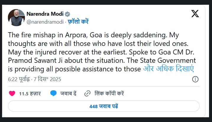 प्रधानमंत्री नरेंद्र मोदी ने भी इस हादसे को बेहद दुखद बताया और मृतकों के परिजनों को 2 लाख रुपये की सहायता राशि देने की घोषणा की। पीएम ने गोवा के मुख्यमंत्री से बात कर राहत कार्यों की जानकारी ली।