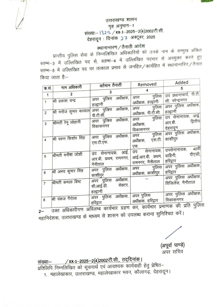 देहरादून: उत्तराखंड सरकार ने सोमवार को पुलिस विभाग में बड़ा प्रशासनिक बदलाव किया है। इस बदलाव के तहत कई भारतीय पुलिस सेवा (IPS) और प्रांतीय पुलिस सेवा (PPS) अधिकारियों का स्थानांतरण किया गया है। गृह विभाग की ओर से जारी आदेश में बताया गया कि सभी अधिकारियों को उनके वर्तमान पदों से अवमुक्त करते हुए जनहित और कार्यहित में नई तैनाती दी गई है।