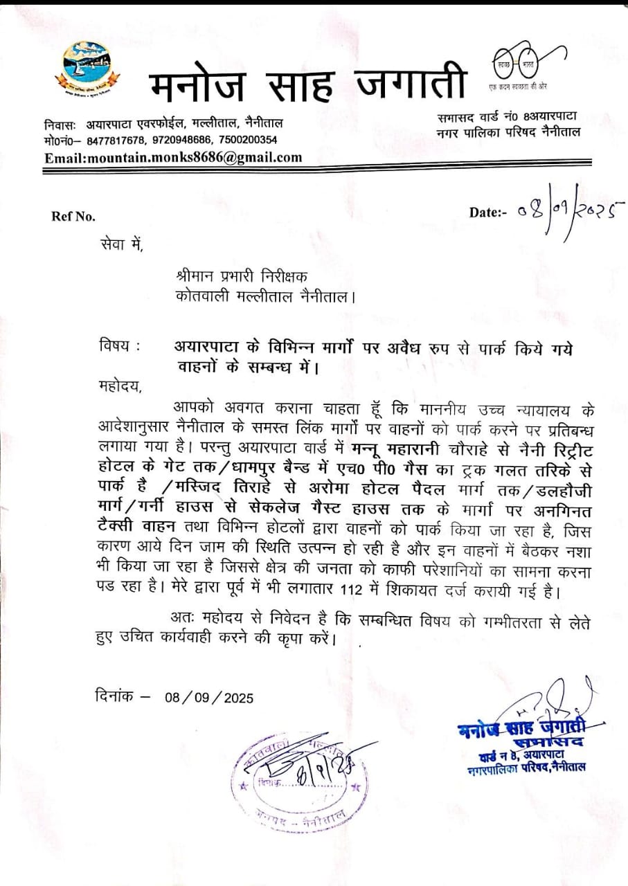 नैनीताल: अयारपाटा क्षेत्र के पार्षद मनोज साह जगाती ने पुलिस प्रशासन को पत्र लिखकर नैनीताल के विभिन्न लिंक मार्गों पर अवैध पार्किंग की समस्या को गंभीर बताया है। उन्होंने कहा कि उच्च न्यायालय के आदेशों के बावजूद मनु महारानी चौक से नैनी रिट्रीट होटल, धामपुर बैंड से एचपी गैस ट्रक, मरिजाद तिराहे से अरोमा होटल, डलहौजी मार्ग और अन्य स्थानों पर वाहनों को गलत तरीके से पार्क किया जा रहा है।