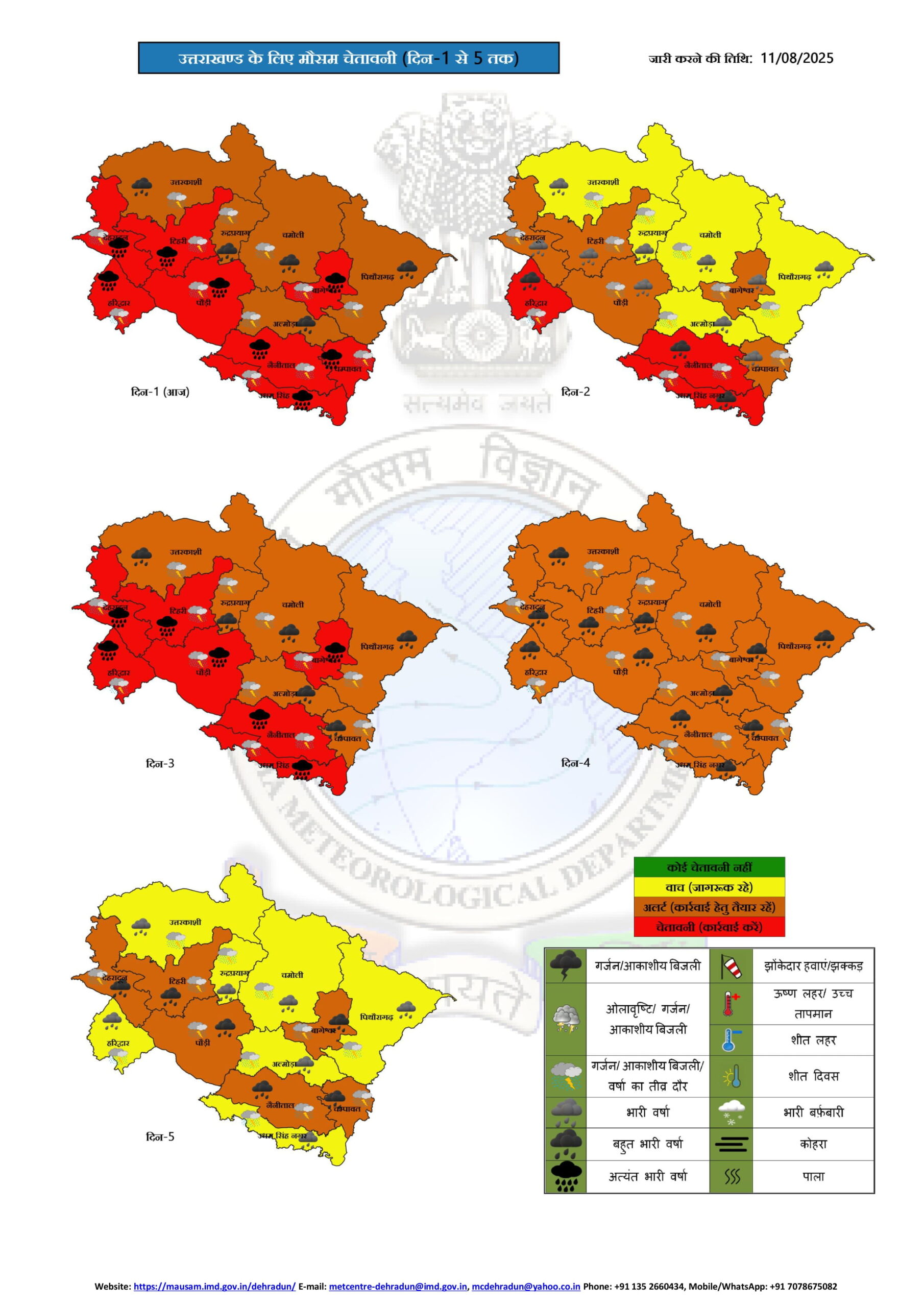 उत्तराखंड: मौसम विभाग के अनुसार आज उत्तराखंड के हरिद्वार, नैनीताल और उधम सिंह नगर जिलों में भारी से बहुत भारी बारिश होगी। इन जिलों में रेड अलर्ट जारी किया गया है। इसके अलावा देहरादून, टिहरी गढ़वाल, पौड़ी गढ़वाल, चंपावत और बागेश्वर में ऑरेंज अलर्ट और शेष जिलों में येलो अलर्ट जारी है। इस दौरान आंधी-तूफान और बिजली गिरने की भी संभावना है।