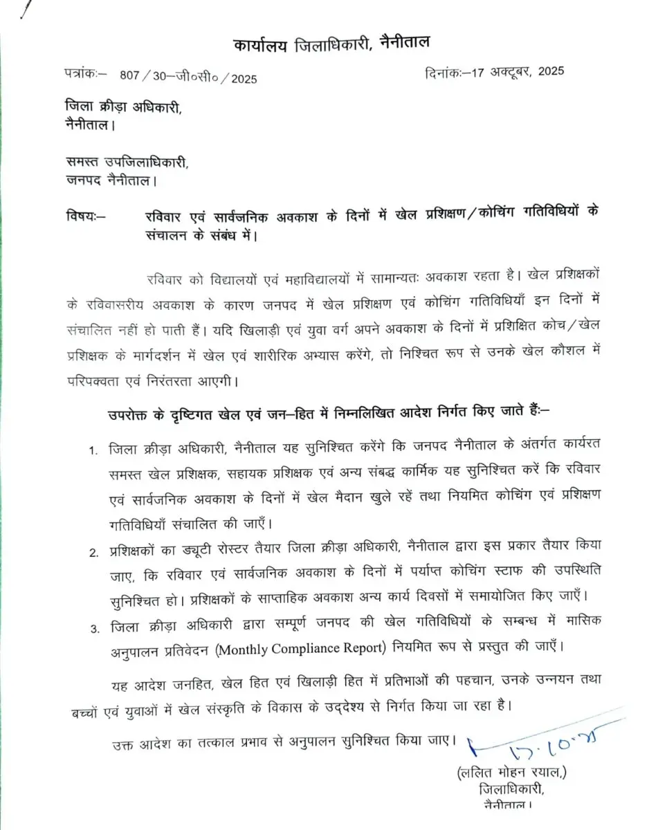 जिलाधिकारी नैनीताल के निर्देश पर जिला क्रीड़ा अधिकारी को आदेश दिए गए हैं कि जनपद के सभी खेल प्रशिक्षक, सहायक प्रशिक्षक और संबंधित कार्मिक यह सुनिश्चित करें कि छुट्टी के दिनों में भी खेल प्रशिक्षण एवं कोचिंग गतिविधियाँ संचालित रहें।