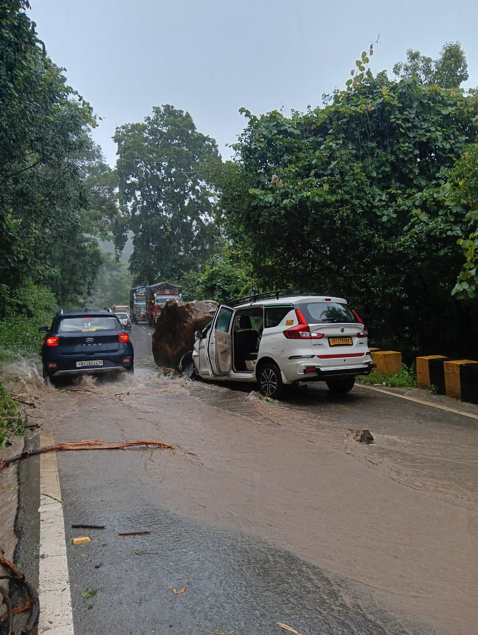 नैनीताल: लगातार तीन दिनों से हो रही तेज बारिश ने जनजीवन को अस्त-व्यस्त कर दिया है। जगह-जगह भूस्खलन और जलभराव की स्थिति बन गई है। इसी बीच हल्द्वानी से नैनीताल की ओर आ रही एक टैक्सी पर बड़ा हादसा टल गया। सड़क पर गिरा एक विशाल बोल्डर सीधे कार के बोनट पर आ गिरा। गनीमत रही कि बोल्डर छत पर नहीं गिरा, वरना टैक्सी में सवार यात्रियों की जान खतरे में पड़ सकती थी। हादसे में टैक्सी चालक और सभी सवारियां बाल-बाल बच गईं।