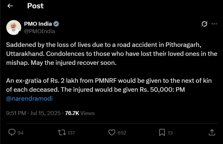 प्रधानमंत्री नरेंद्र मोदी ने भी इस हादसे पर गहरा शोक जताया है। पीएमओ के एक्स हैंडल से जारी संदेश में उन्होंने पीड़ित परिवारों के प्रति संवेदना व्यक्त की और घायलों के जल्द स्वस्थ होने की कामना की। साथ ही प्रधानमंत्री राष्ट्रीय राहत कोष से मृतकों के परिजनों को 2 लाख रुपये और घायलों को 50 हजार रुपये की आर्थिक सहायता देने की घोषणा की गई है।