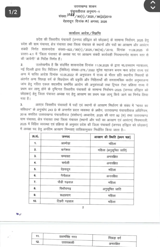 उत्तराखंड: उत्तराखंड सरकार ने त्रिस्तरीय पंचायत सामान्य निर्वाचन-2025 (हरिद्वार को छोड़कर) के अंतर्गत जिला पंचायत अध्यक्ष पदों के लिए अनंतिम आरक्षण सूची जारी कर दी है। यह आरक्षण संविधान के अनुच्छेद 243-D, उत्तराखंड पंचायतीराज अधिनियम 2016 (संशोधित 2025) और आरक्षण नियमावली 2025 के अनुरूप तैयार किया गया है।