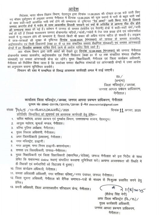 भारी बारिश और भूस्खलन की आशंका को देखते हुए जिला प्रशासन ने मंगलवार, 12 अगस्त को जिले के सभी सरकारी, अर्द्धसरकारी और निजी स्कूलों (कक्षा 1 से 12 तक) के साथ सभी आंगनबाड़ी केंद्रों में अवकाश घोषित कर दिया है।