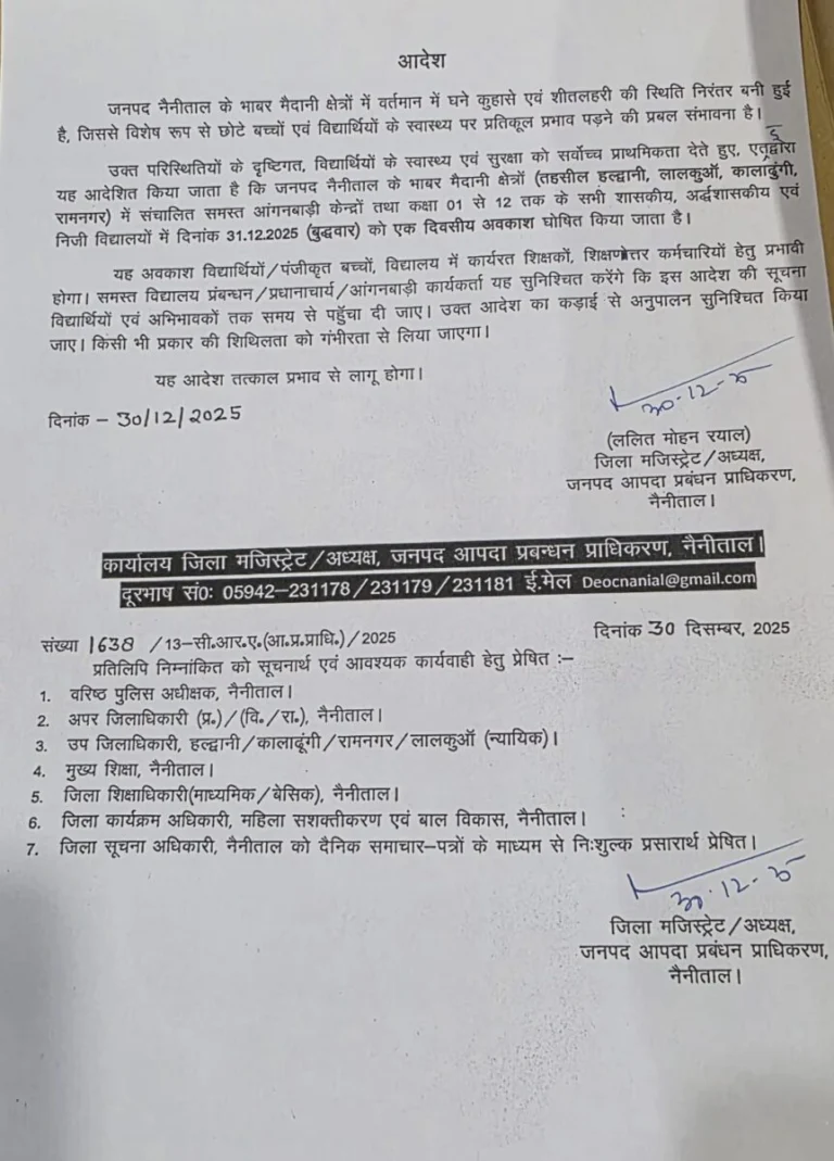 इस स्तिथि को ध्यान में रख्ते हुए कल जिले के भाबर क्षेत्रों मे तहसील हल्द्वानी, लालकुआं, कलढूंगी, रामनगर में आने वाले सभी आगनबाड़ी व कक्षा 1 से 12 तक के सभी प्रकार के स्कूलों मे कल 31.12.2025 को एक दिन का अवकवश घोषित किया गया हैं।
