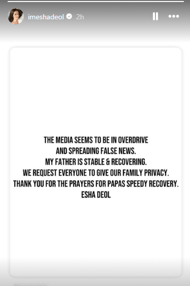 “मेरे पिता स्थिर हैं और स्वस्थ हो रहे हैं। कृपया झूठी खबरों पर ध्यान न दें और हमारी निजता का सम्मान करें। पापा के जल्द ठीक होने की प्रार्थना करने के लिए सभी का धन्यवाद।”