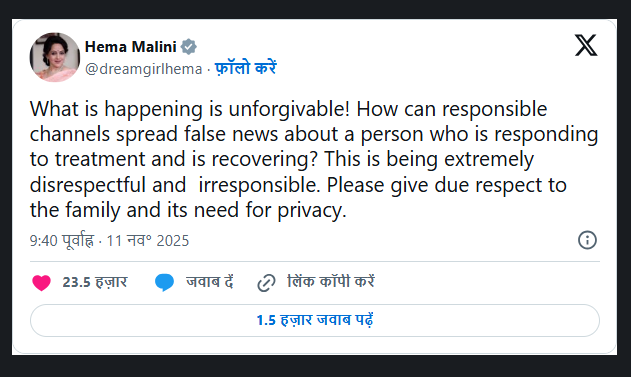 हेमा मालिनी ने सोशल मीडिया प्लेटफ़ॉर्म X (पूर्व ट्विटर) पर नाराजगी जताते हुए लिखा —