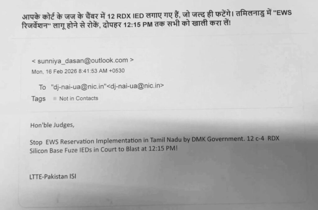 धमकी भरे मेल में जज के चैंबर में आरडीएक्स आईईडी लगाए जाने का जिक्र किया गया था और तय समय से पहले परिसर खाली कराने की बात लिखी गई थी। सुबह करीब साढ़े आठ बजे आए इस मेल की जानकारी मिलते ही पुलिस, बम निरोधक दस्ते और डॉग स्क्वॉड की टीमें मौके पर पहुंच गईं। न्यायालयों के अंदर और बाहर हर आने-जाने वाले की जांच की गई और संदिग्ध वस्तुओं की तलाश में कोना-कोना खंगाला गया।