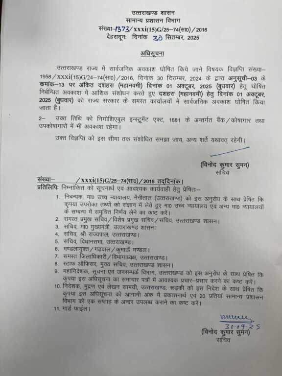 उत्तराखंड: राज्य में दशहरा (महानवमी) के अवसर पर सरकार ने 1 अक्टूबर, 2025 (बुधवार) को सभी सरकारी कार्यालयों में पूर्ण सार्वजनिक अवकाश की घोषणा की है। पहले यह तिथि केवल आंशिक अवकाश के रूप में सूचीबद्ध थी, लेकिन अब इसे पूर्ण अवकाश के रूप में संशोधित कर दिया गया है।