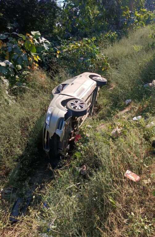 तेज़ी से सामने आए गोवंश से कार टकराई और अनियंत्रित होकर खाई में जा गिरी।